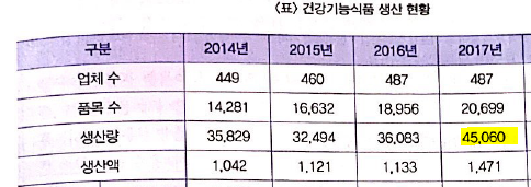 우선 보기 ㉠을 보도록 하겠습니다. 2017년에 건강기능식품 생산량을 알아야 합니다.