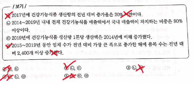 다음 보기 ㉡을 보도록 하겠습니다. 2014년~2019년 내내 전체 건강기능식품 매출액에서 국내 매출액이 차지하는 비중은90% 이상인지 알아보아야 합니다. 여기까지 보기를 읽었으면 우선, 비중을 구하긴 해야 하는데, 2014년 부터 2019년 까지 5개년도에 대해 계산을 해야하니 시간이 많이 걸릴 것이라는 생각이 들어야 합니다. 그러므로 보기 ㉡은 보류하도록 하겠습니다.